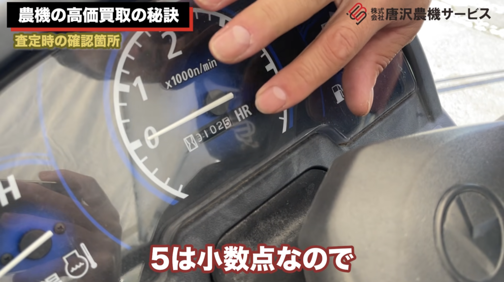 特に重要なのがアワーメーター(使用時間)です。例えば「1025」と表示されている場合、実際には102時間稼働しているケースもあります。